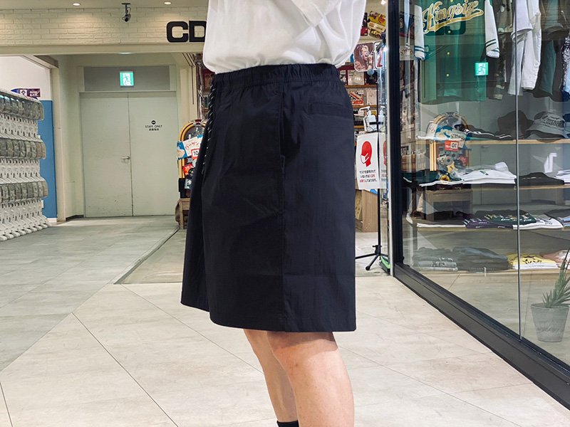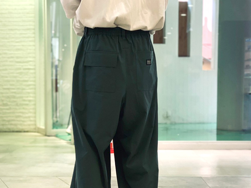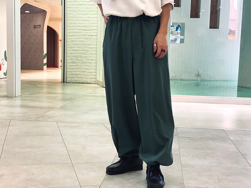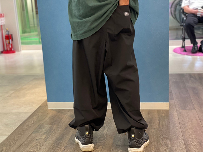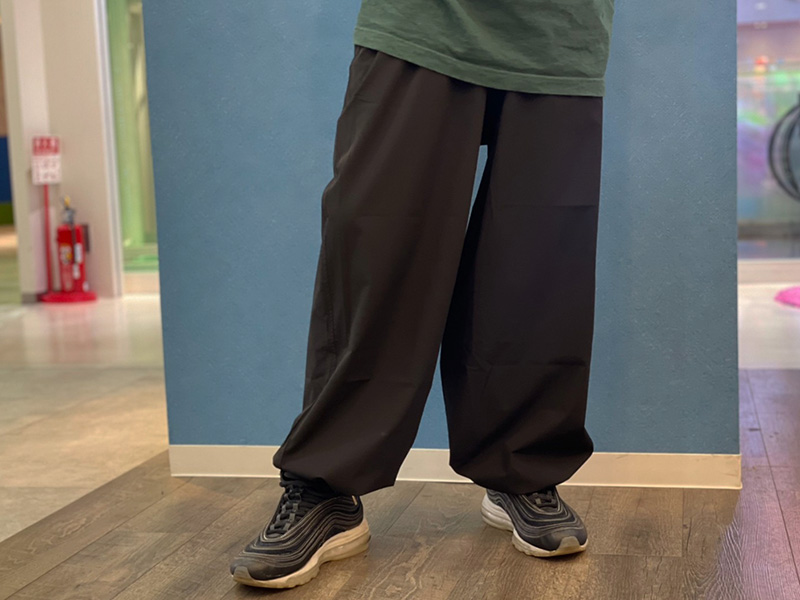 ストレッチの効いたナイロン素材にウェストゴム仕様でリラックスして着用できるイージーパンツ。裾部分のドローコードでシルエットを調整できるのも魅力。