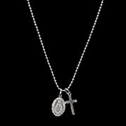 クロスとマリアのチャームを重ね着けしたシルバーネックレス。クロスとマリアのチャームがスタイリッシュなデザインでスタイリングのアクセントに大活躍するユニセックスでおすすめのアイテム。留め具には着脱のしやすいカニカンを使用。