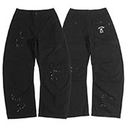 ワークウェアの定番であるベイカーパンツを、トレンドのバレルシルエットで再構築した一本。膝の内側にダーツを入れ、立体裁断を施した緩やかにカーブするゆったりとしたワイドなシルエットが特徴。ランダムに施された控えめなスプラッシュペイント加工が、ハードすぎずアーティスティックな印象。綿100%の顔料染めバックサテン素材にユーズド加工を施したヴィンテージな雰囲気が魅力。バックポケットに人気のNo.5ロゴを配置。無骨なシルエットや雰囲気が抜群のパンツです。