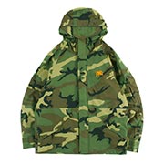 オーセンティックなウッドランドカモ柄に、鮮やかなオレンジのDRAWロゴのワンポイント刺繍がアクセントになった定番人気のマウンテンジャケット。フロントはダブルジッパーとスナップボタンで開閉。内側のウエスト部分はゴムの絞りになっており、外気の進入を防ぎます。脇から腕にはジッパーで大きく開くベンチレーション付き。前立て内にはマジックテープ開閉の胸ポケット(フロントジッパーを開けずに開閉可能)など機能性抜群の一着。本格的なミリタリースペックを感じさせつつ、タウンユースとしても重宝し、ゆったりとしたシルエットで春秋にはライトアウターとして、夏にはレインウェアとして、冬にはインナーにフリースなどを重ね着することで非常に保温性の高い防寒アウターとしてシーズンを通して活躍するアウターです。