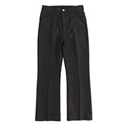 往年のカウボーイパンツをベースに、現代的な解釈を加えた一本。ポリエステルを混紡した生地を使用し、シワになりにくく、スタプレのようなセンタープレスのキープ力と、上品な微光沢が特徴です。シルエットは、膝下からわずかに広がる絶妙なセミブーツカット。脚を長く、細く見せる視覚効果は抜群です。最大の特徴は、見た目の端正さに反したストレッチ性。細身ながらも動きを妨げず、カジュアルやキレイめスタイルにデイリーユースで大活躍するユニセックスでオススメのアイテムです。