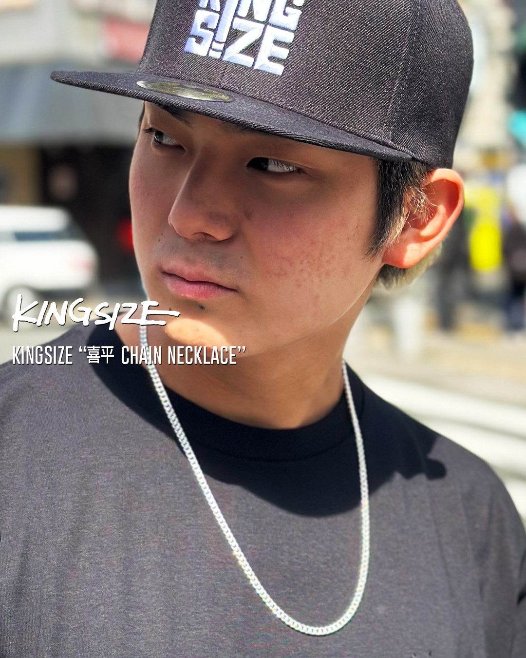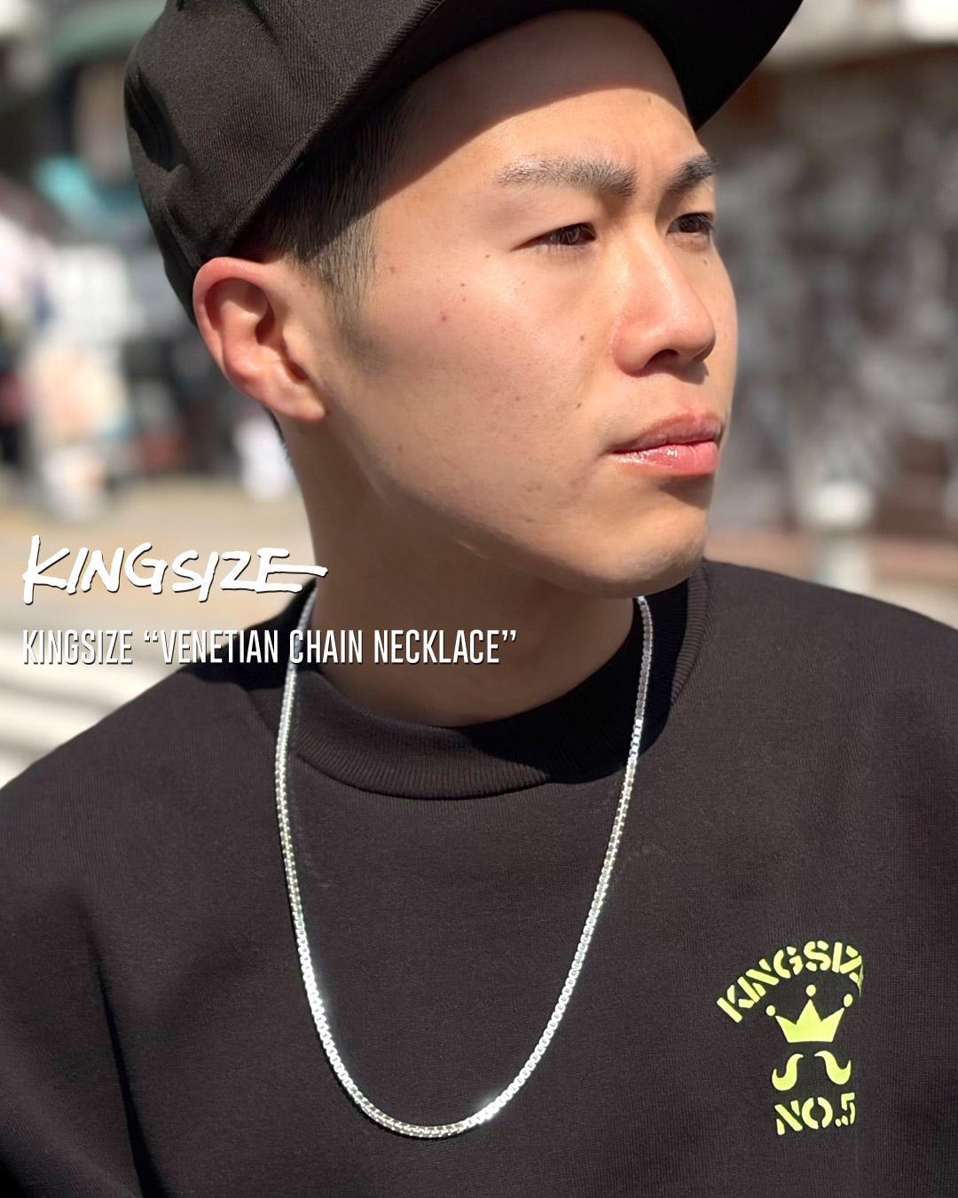 四角いコマを隙間なく編み込んだ「ベネチアンチェーン」は、その直線的なシルエットが生み出す鏡面のような輝きが魅力。2.7mmという絶妙な太さは、単体でもしっかりとした主張があり、存在感がありつつもデイリーユースで活躍する絶妙なサイズです。クラスプ部分には「KINGSIZE」のブランドロゴが刻印されたオリジナルタグを配し、バックスタイルまで抜かりないデザインに仕上げました。これ一本でネックレスとしての完成度が高く、スタイリングのアクセントにも最適です。一生モノのシルバーアクセサリーとして、ぜひ手に入れてほしい逸品。