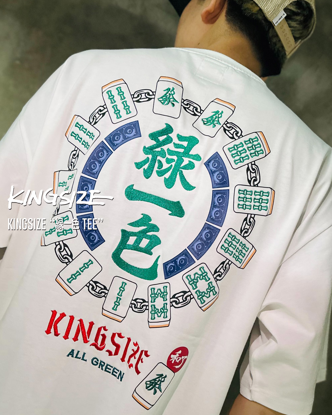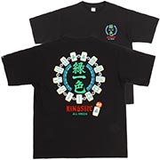 すべてを緑の牌で揃えた美しい役満「緑一色(リューイーソー)」をサンプリングしたTシャツ。『緑一色』の刺繍にスピーカー・麻雀牌・鎖のグラフィックスがブランドの音楽的バックボーンとストリート、「緑」のカルチャーをクロスオーバー。ブランドロゴの刺繍と「和了(ホーラ)」の刻印、すべての準備が整ったことを示すALL GREENなメッセージが遊び心たっぷりでエッジの効いた仕上がりです。繊細な刺繍とプリントをMIXさせたハイクォリティなデザインが魅力。チルな時間も、勝負の夜も、この一枚があればすべてが整う。ゆったりとしたシルエットにシルキーで肌触りの良い生地感がリラックスして着用できるユニセックスでおすすめの一枚。