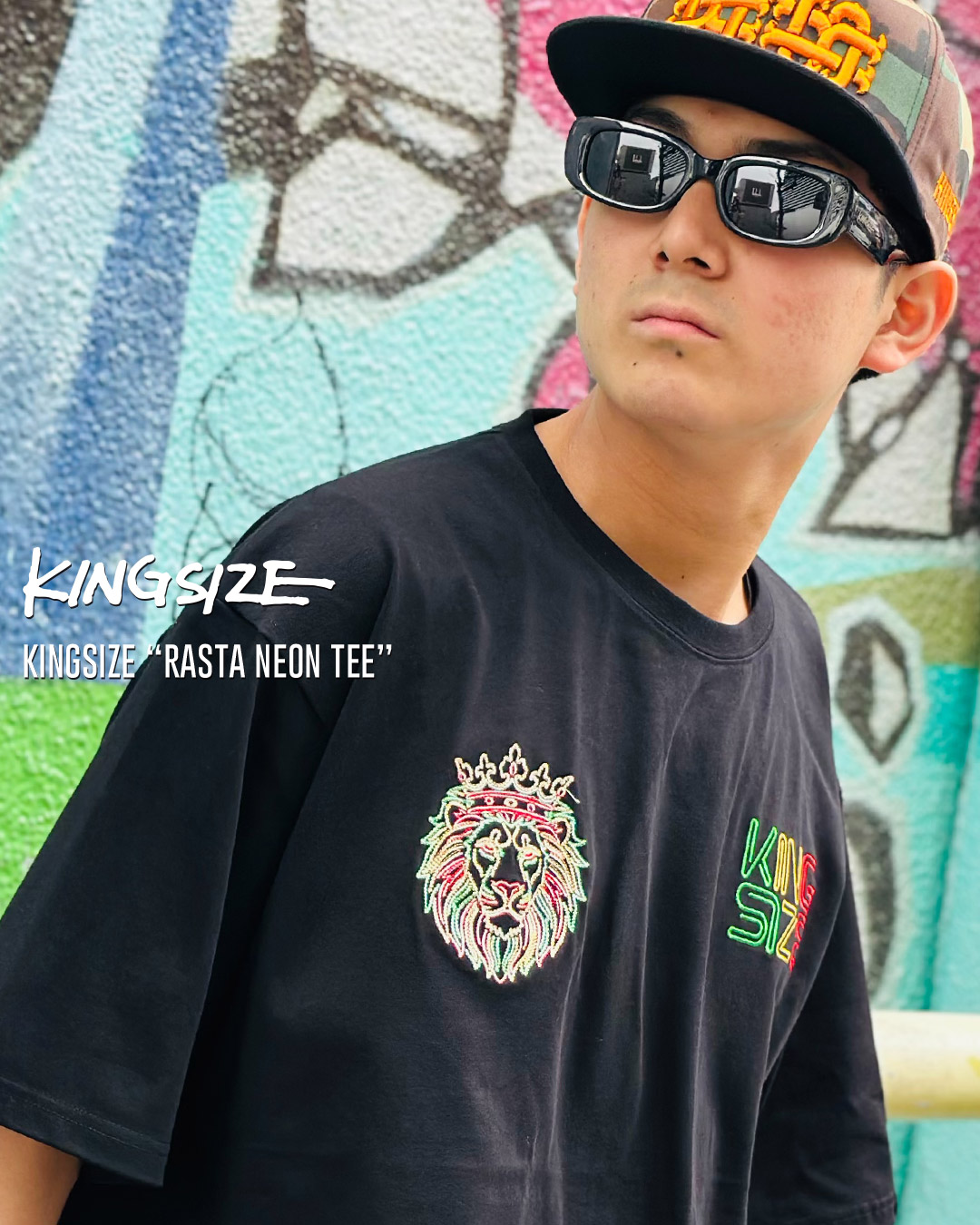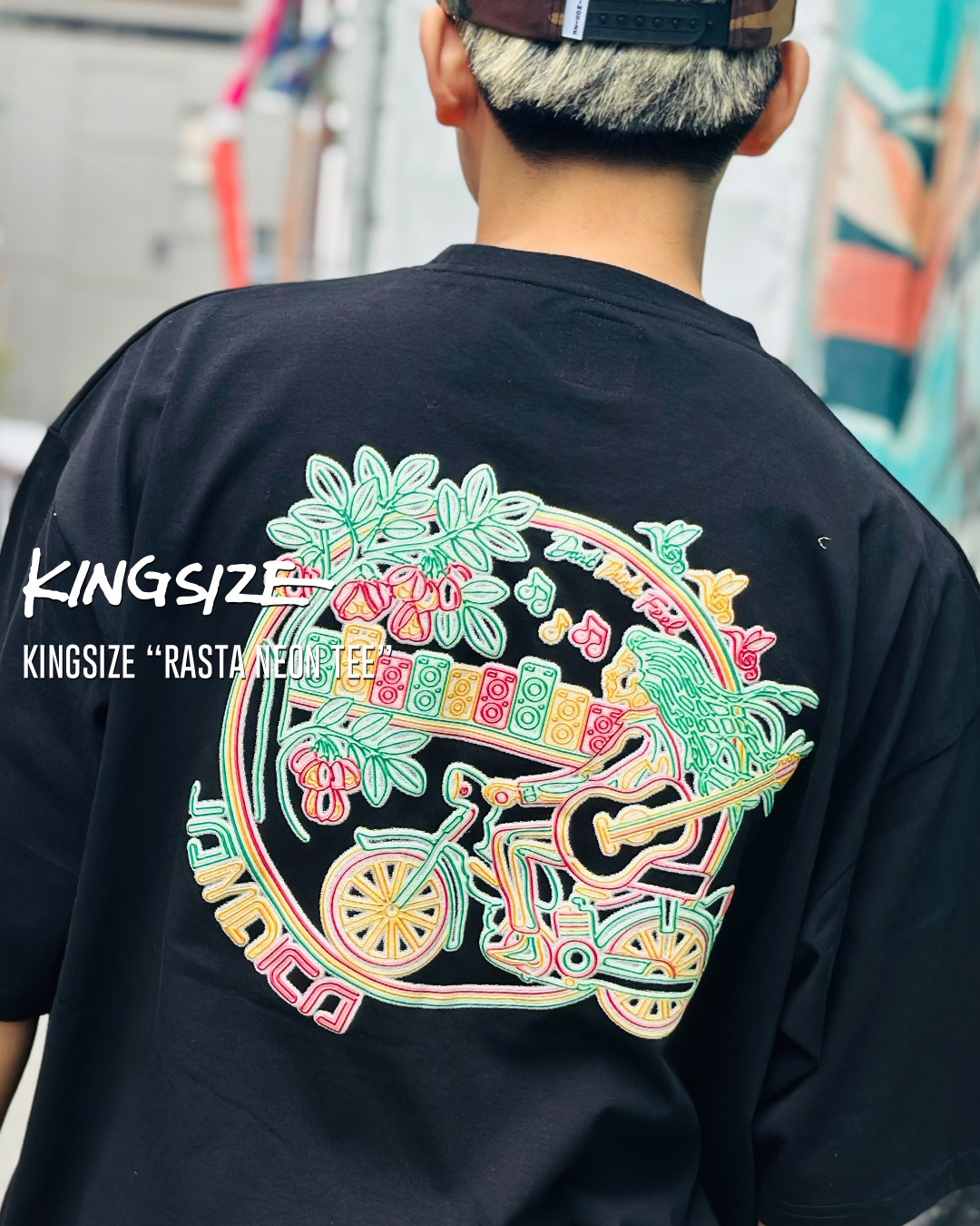 バックには、バイクに跨るギタリストやサウンドシステムなど、レゲエカルチャーを象徴するモチーフをラスタカラーのネオンアート風にレイアウトしました。ジャマイカの日常を切り取ったようなノスタルジックな風景を凹凸感のある発泡プリントで仕上げた存在感あるアイテム。フロントのライオンロゴは、繊細なステッチでネオンの質感を再現した贅沢な仕上がり。ブランドの象徴であるロゴをラスタカラーで刺繍しました。ゆったりとしたトレンド感のあるシルエットが、ストリートでの存在感も抜群。ディテールへのこだわりが、シンプルな着こなしに圧倒的な個性をプラスします。ゆったりとしたシルエットにシルキーで肌触りの良い生地感がリラックスして着用できるユニセックスでおすすめの一枚。